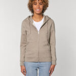 The iconic zip-through hooded sweatshirt for women in 350gsm brushed fleece. Crafted from premium 85% organic cotton and 15% recycled polyester. Featuring premium matt silver trims and zip, with clean herringbone internal tape finishing at zip, double fabric hood lining and twin-needle top stitching.